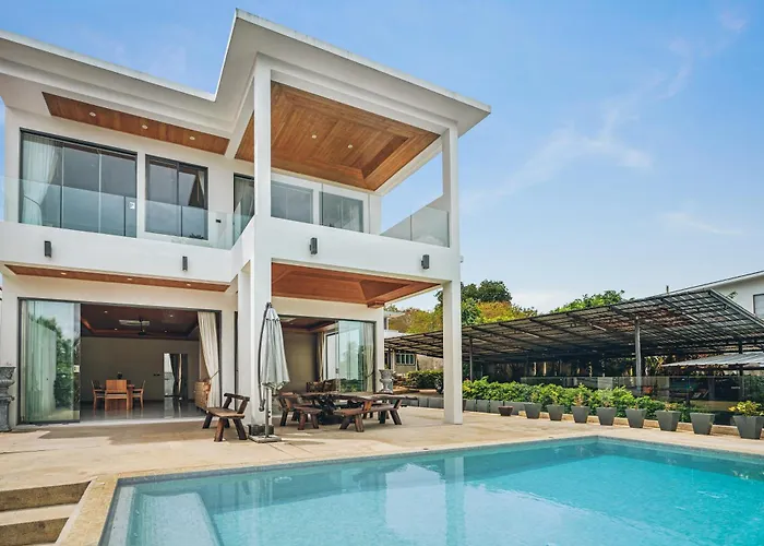 Situated approximately 5 minutes' walk from the Air Wellfit wellness center, Anara Pool Villa 3 Bedrooms Amphoe Koksamui offers quick access to numerous city landmarks nearby. Located 4.2 km from the Chaweng Boxing Stadium, this Amphoe Koksamui villa boasts a terrace with views of the mountain.